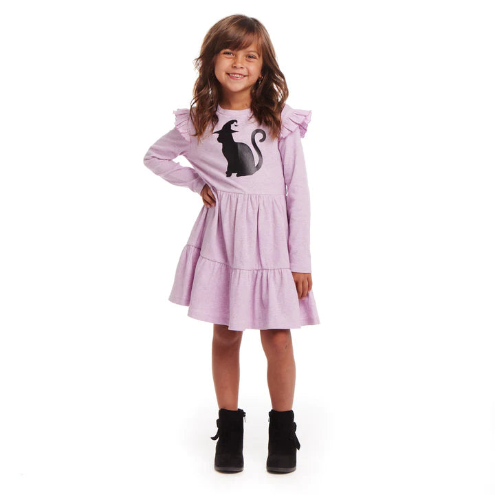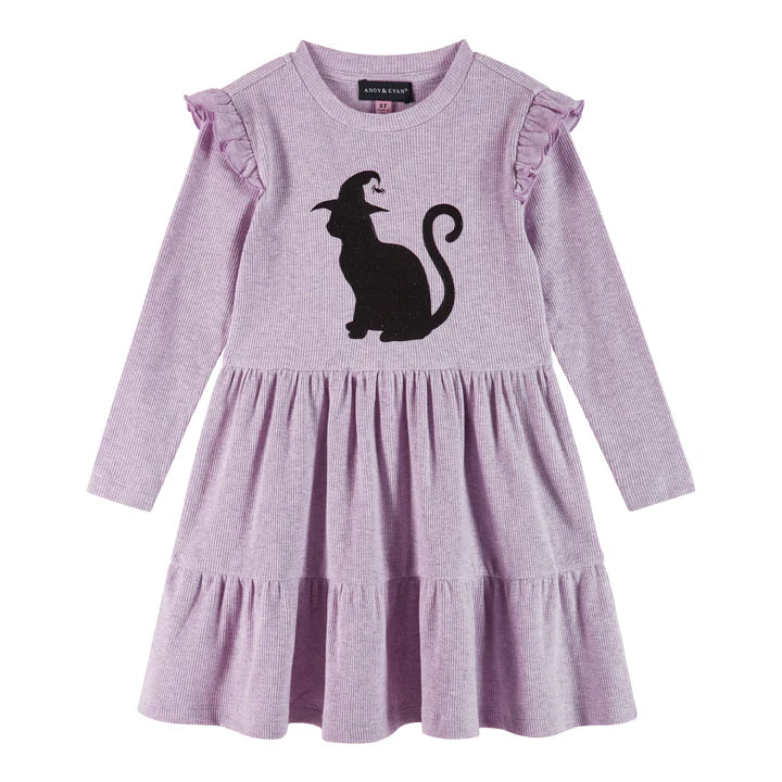 Let your little one embrace the magic of the season with this enchanting lavender dress, featuring an adorable black cat silhouette. Perfect for Halloween or any day of the year, this dress combines whimsical charm with cozy comfort. Watch your child light up with joy in this delightful outfit!