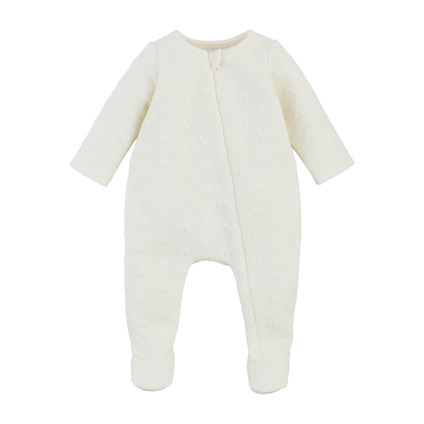 High-quality quilted jacquard fabric. Ivory color with quilted heart pattern. Footed design for warmth and protection.
