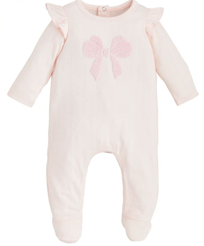 Pink pointelle footed sleeper with boucle bow embroidery. Includes built-in scratch protector hand mitts and inner leg snaps.