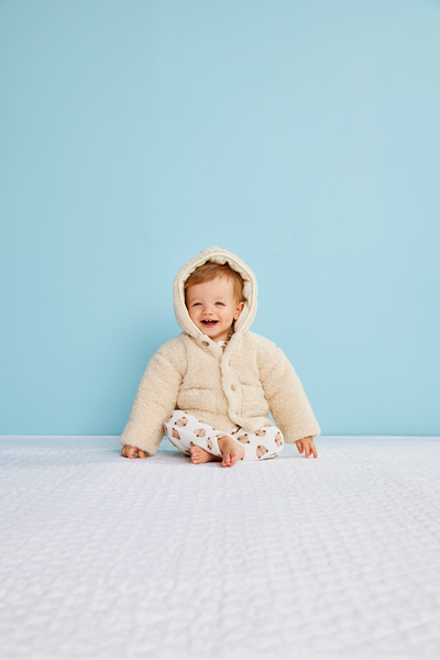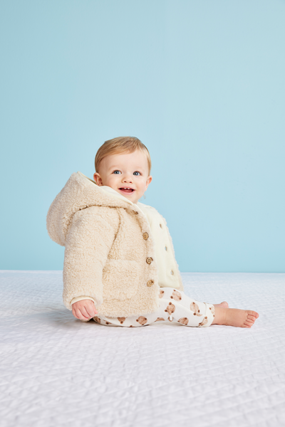 Cozy hoodie lined with soft jersey material. Unique coconut wood button closure. Front pockets for storage or keeping hands warm. Rib sleeve openings for a snug fit and to keep cold air out.